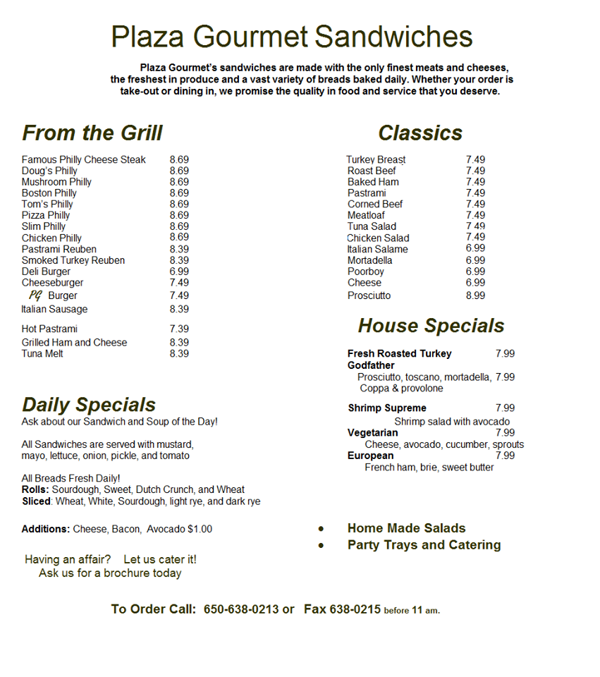 Plaza Gourmet Delicatessen, located in Foster City, CA, offers a mouth-watering selection of cheesesteaks, deli sandwiches, and more. Customers rave about the hot pastrami, Philly cheesesteak, and mushroom and cheese Philly sandwiches. The Godfather sandwich is a must-try, filled with Italian sub goodness. The menu also features a grilled honey turkey melt, which is praised for its flavorful taste. With indoor and outdoor seating available, Plaza Gourmet Delicatessen provides a cozy dining experience. The owner, Pam, is known for being friendly and accommodating. While there may be some limitations due to outdoor seating changes, the quick service and delicious food make it a top choice for sandwich lovers. Don't miss out on their signature fries, a perfect complement to any meal at Plaza Gourmet Delicatessen.
